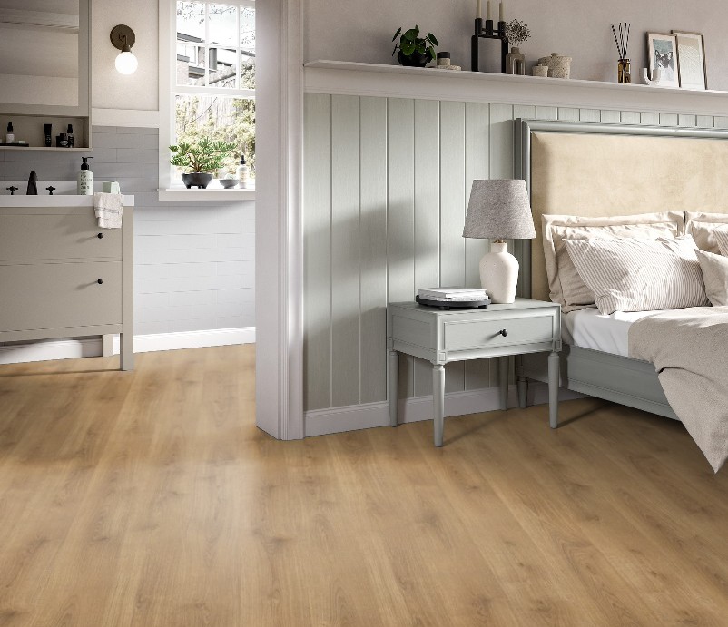 Una de las ventajas destacadas del Roble Casena es su excelente comportamiento frente a la humedad. Gracias a su tablero HDF de alta densidad con protección antihumedad mejorada y a un sistema de unión de alta precisión, este suelo laminado ofrece una gran resistencia a las salpicaduras y derrames accidentales (protección superficial de hasta 72 horas), haciéndolo perfectamente apto para su instalación en cocinas e incluso en baños.